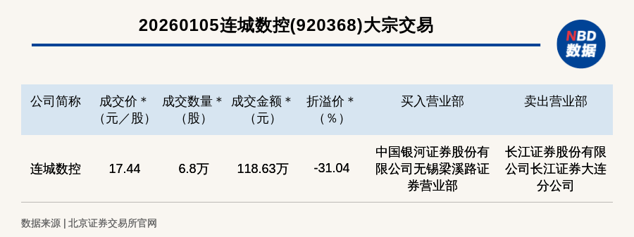 每经讯,2026年1月5日,北交所上市公司连城数控(920368,收盘价:25.29元)发生一笔大宗交易,成交价17.44元/股,成交数量6.8万股,成交金额118.63万元,折价31.04%。买入营业部是中国银河证券股份有限公司无锡梁溪路证券营业部,卖出营业部是长江证券股份有限公司长江证券大连分公司。
