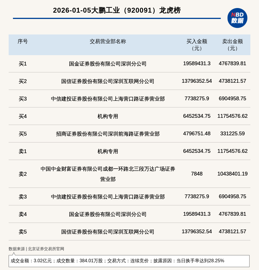 每经讯,2026年1月5日,北交所上市公司大鹏工业(920091,收盘价:77.25元)登上龙虎榜,交易方式是连续竞价,披露原因是当日换手率达到28.25%,成交数量384.01万股,成交金额3.02亿元。买一席位为国金证券股份有限公司深圳分公司,买入1958.94万元;卖一席位为机构专用,卖出1175.46万元。