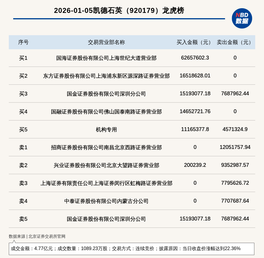 每经讯,2026年1月5日,北交所上市公司凯德石英(920179,收盘价:47.28元)登上龙虎榜,交易方式是连续竞价,披露原因是当日收盘价涨幅达到22.36%,成交数量1089.23万股,成交金额4.77亿元。买一席位为国海证券股份有限公司上海世纪大道营业部,买入6265.76万元;卖一席位为招商证券股份有限公司南昌北京西路证券营业部,卖出1205.18万元。