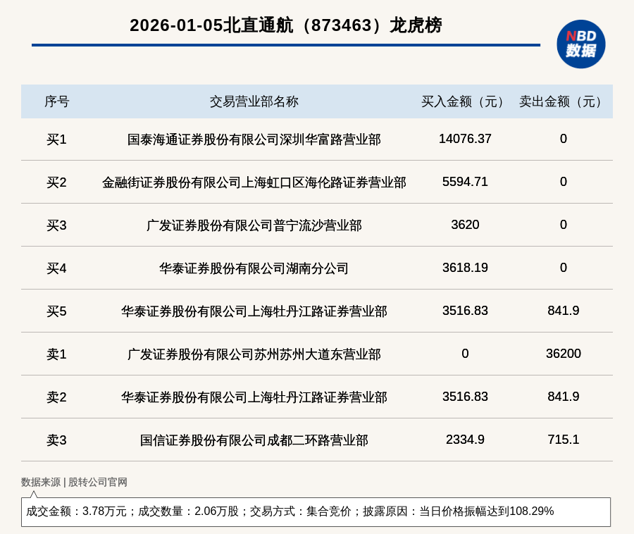 每经讯,2026年1月5日,新三板创新层公司北直通航(873463,收盘价:2.3元)登上龙虎榜,交易方式是集合竞价,披露原因是当日价格振幅达到108.29%,成交数量2.06万股,成交金额3.78万元。买一席位为国泰海通证券股份有限公司深圳华富路营业部,买入1.41万元;卖一席位为广发证券股份有限公司苏州苏州大道东营业部,卖出3.62万元。