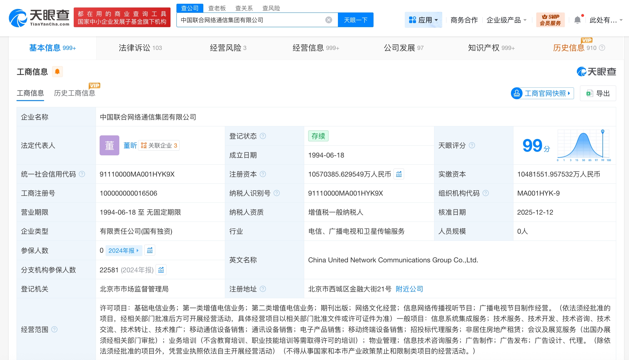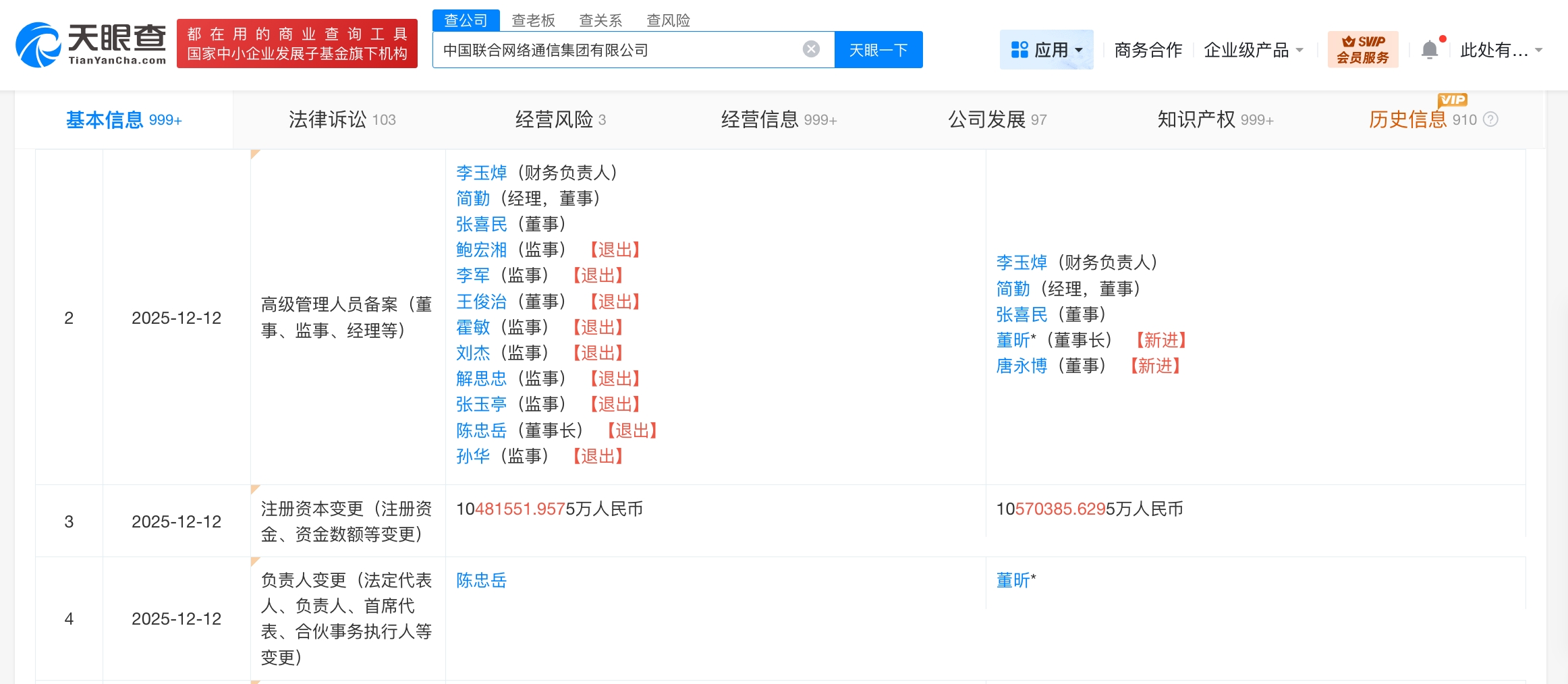 每经AI快讯,天眼查工商信息显示,近期,中国联合网络通信集团有限公司发生工商变更,陈忠岳卸任法定代表人、董事长,由董昕接任,注册资本由约1048亿人民币增至约1057亿元人民币,同时,多位高管发生变更。该公司成立于1994年6月,经营范围含基础电信业务、网络文化经营、信息网络传播视听节目、广播电视节目制作经营、信息系统集成服务。股东信息显示,该公司由国务院国有资产监督管理委员会全资持股。