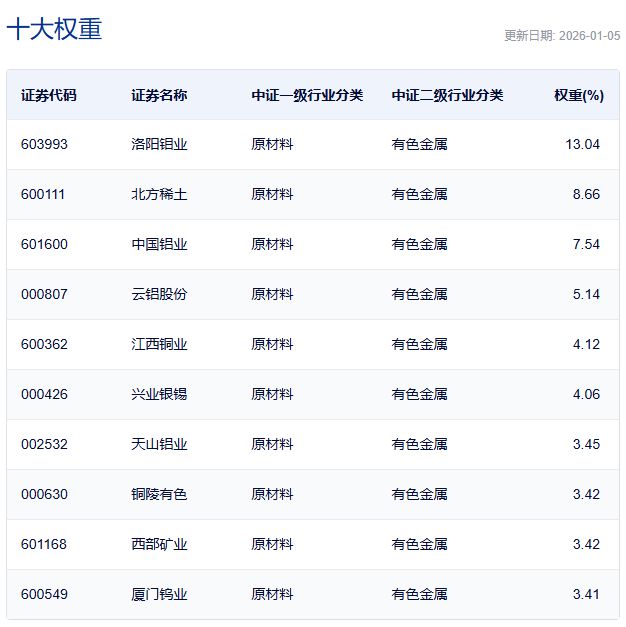 中证工业有色金属主题指数选取市值较大的30只业务涉及铜、铝、铅锌、稀土金属等行业的上市公司证券作为指数样本,以反映工业有色金属主题上市公司证券的整体表现。