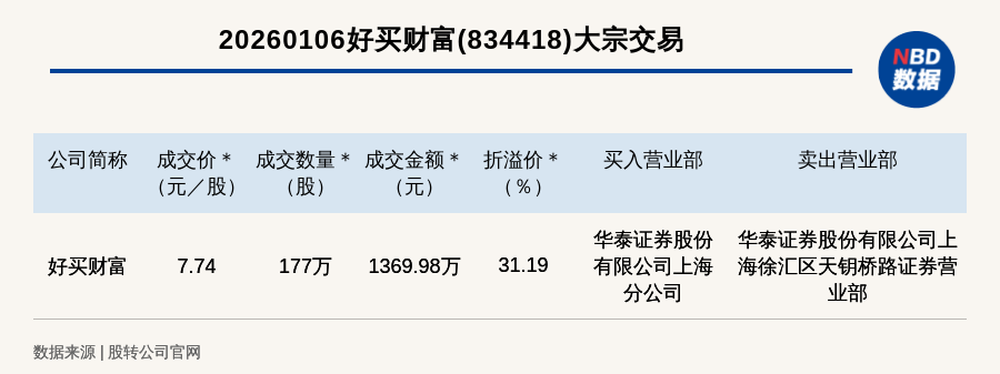 每经讯,2026年1月6日,新三板创新层公司好买财富(834418,收盘价:5.9元)发生一笔大宗交易,成交价7.74元/股,成交数量177万股,成交金额1369.98万元,溢价31.19%。买入营业部是华泰证券股份有限公司上海分公司,卖出营业部是华泰证券股份有限公司上海徐汇区天钥桥路证券营业部。