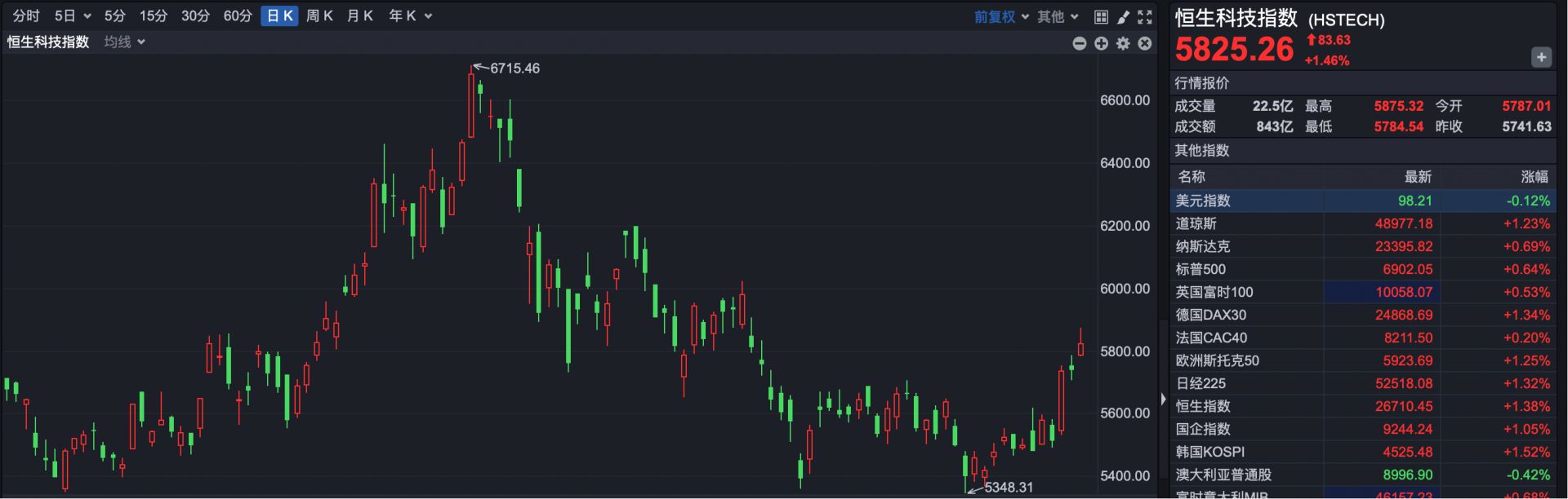 恒生科技指数一度涨超2.3%,最终报收于5825.26点,上涨83.63点,涨幅1.46%。