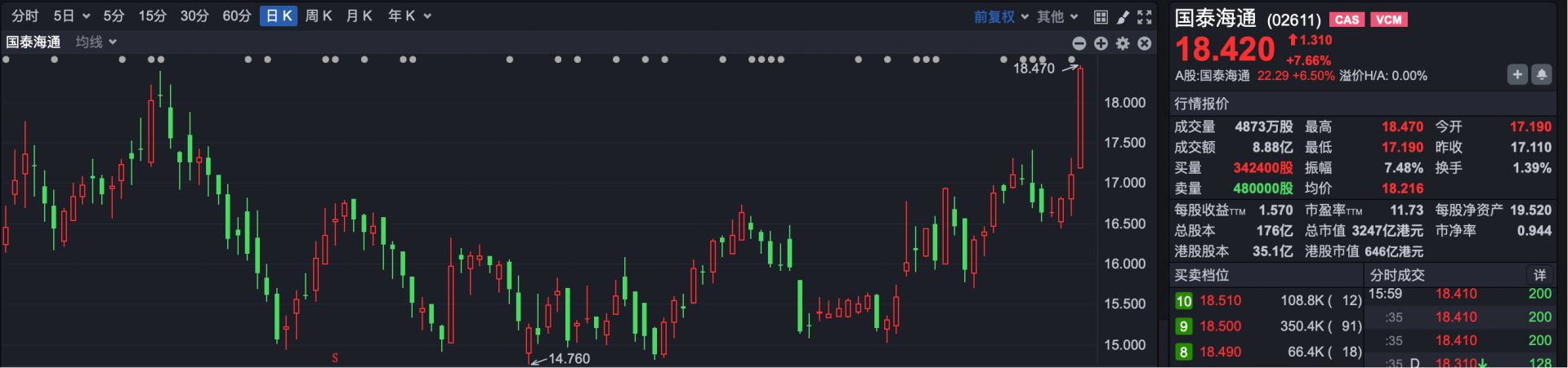 再看今日盘面焦点,金融股全天维持强势。其中,券商股整体走强,国泰君安国际(HK01788)涨超12%、招商证券(HK06099)涨超11%、申万宏源香港涨超9%、中金公司涨超8%、国泰海通及申万宏源均涨超7%。