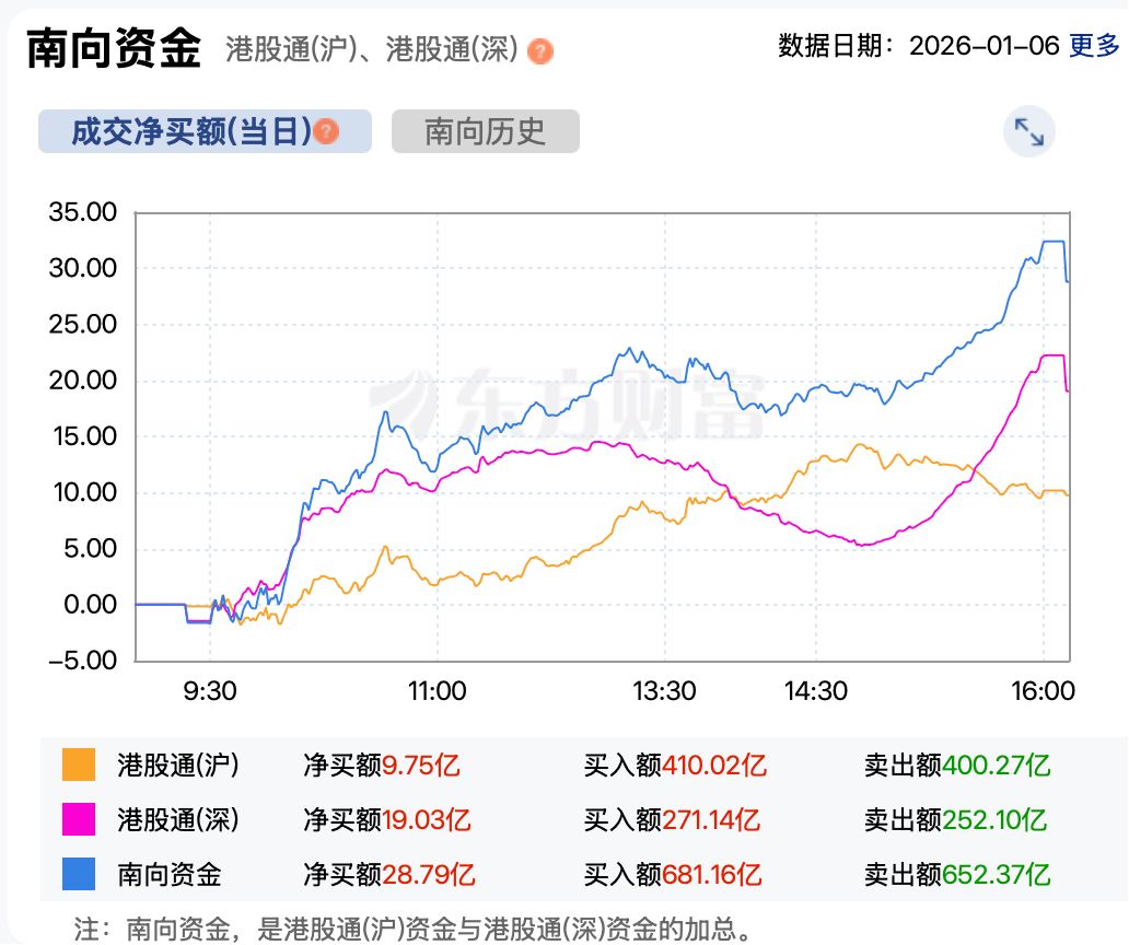 资金方面,继昨日南向资金疯狂买入之后,今日南向资金继续净买入港股。截至收盘,南向资金净买入港股超28亿港元。