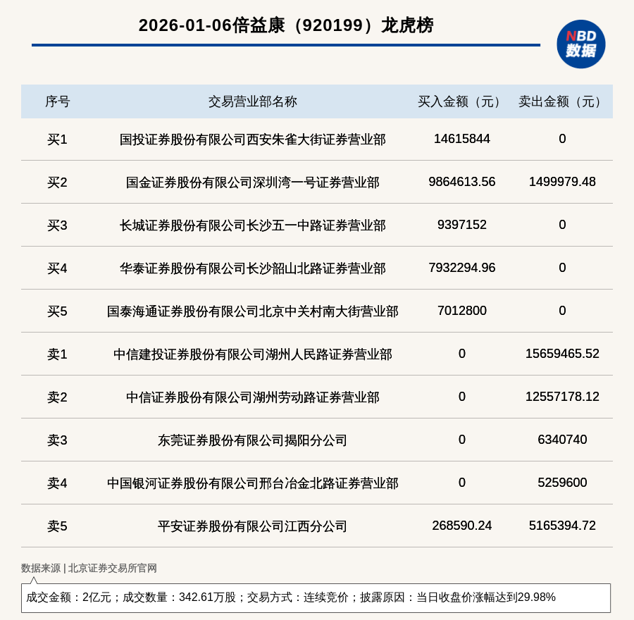 每经讯,2026年1月6日,北交所上市公司倍益康(920199,收盘价:58.44元)登上龙虎榜,交易方式是连续竞价,披露原因是当日收盘价涨幅达到29.98%,成交数量342.61万股,成交金额2亿元。买一席位为国投证券股份有限公司西安朱雀大街证券营业部,买入1461.58万元;卖一席位为中信建投证券股份有限公司湖州人民路证券营业部,卖出1565.95万元。