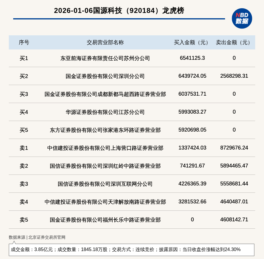 每经讯,2026年1月6日,北交所上市公司国源科技(920184,收盘价:22.35元)登上龙虎榜,交易方式是连续竞价,披露原因是当日收盘价涨幅达到24.30%,成交数量1845.18万股,成交金额3.85亿元。买一席位为东亚前海证券有限责任公司苏州分公司,买入654.11万元;卖一席位为中信建投证券股份有限公司上海营口路证券营业部,卖出872.97万元。