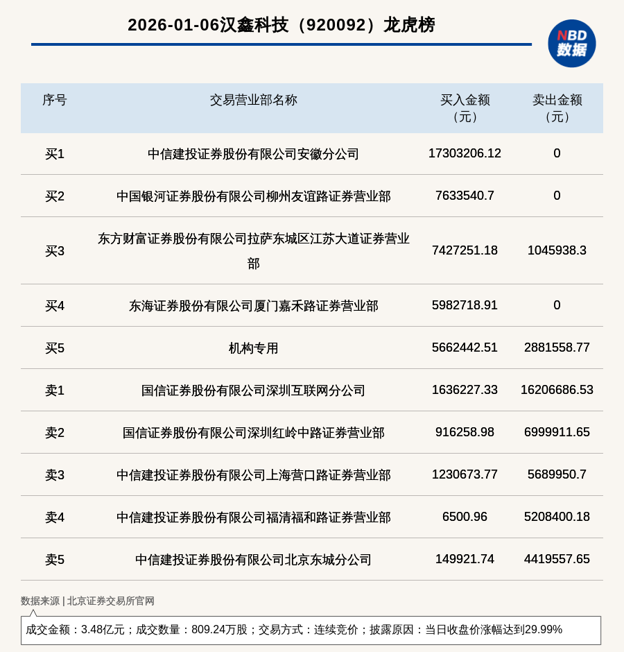 每经讯,2026年1月6日,北交所上市公司汉鑫科技(920092,收盘价:48.89元)登上龙虎榜,交易方式是连续竞价,披露原因是当日收盘价涨幅达到29.99%,成交数量809.24万股,成交金额3.48亿元。买一席位为中信建投证券股份有限公司安徽分公司,买入1730.32万元;卖一席位为国信证券股份有限公司深圳互联网分公司,卖出1620.67万元。