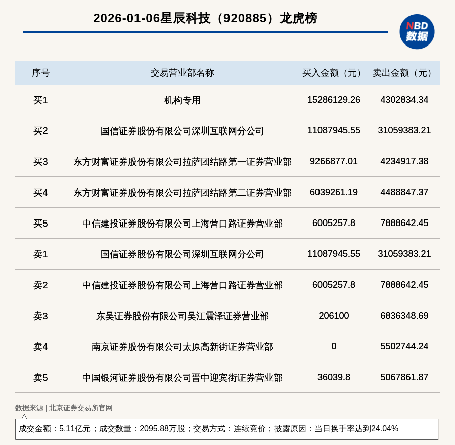 每经讯,2026年1月6日,北交所上市公司星辰科技(920885,收盘价:25.82元)登上龙虎榜,交易方式是连续竞价,披露原因是当日换手率达到24.04%,成交数量2095.88万股,成交金额5.11亿元。买一席位为机构专用,买入1528.61万元;卖一席位为国信证券股份有限公司深圳互联网分公司,卖出3105.94万元。