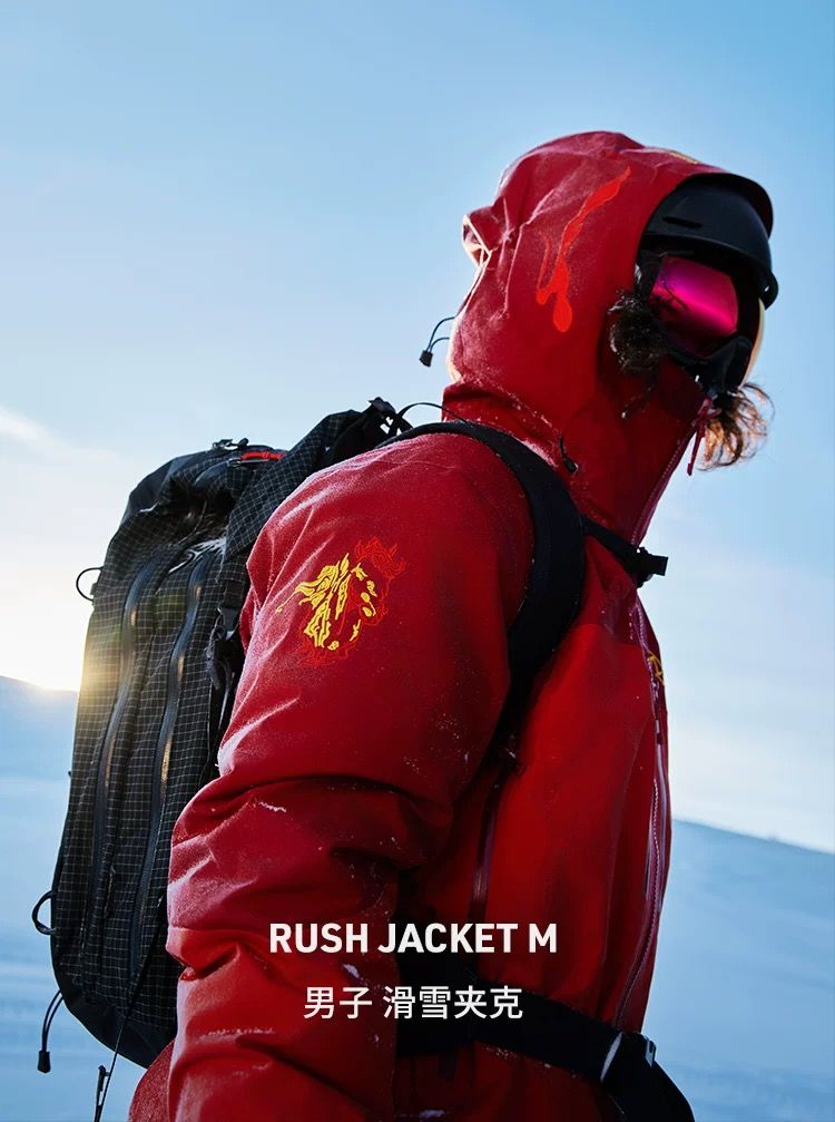 Alpha SV在始祖鸟体系中定位明确:高山攀登向导级硬壳,强调极端环境下的防护能力与耐用性,也是品牌技术形象的集中体现。而马年限定首次改用RUSH JACKET。从产品定位看,RUSH JACKET是一款轻量化滑雪硬壳,针对单双板滑雪及野雪场景优化,更强调活动自由度与雪地防护,在应用场景上明显向滑雪和大众化户外运动靠拢。