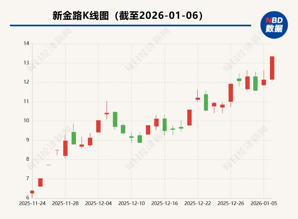 1月6日,新金路(SZ000510,股价13.34元,总市值86.52亿元)股价强势涨停。自2025年10月以来,该股累计涨幅已实现翻倍。