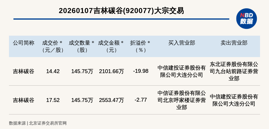 每经讯,2026年1月7日,北交所上市公司吉林碳谷(920077,收盘价:18.02元)发生2笔大宗交易,折价率最高的一笔成交价14.42元/股,成交数量145.75万股,成交金额2101.66万元,折价19.98%。买入营业部是中信建投证券股份有限公司大连分公司,卖出营业部是东北证券股份有限公司九台站前路证券营业部。