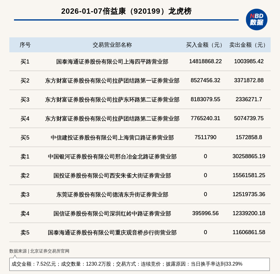 每经讯,2026年1月7日,北交所上市公司倍益康(920199,收盘价:55.69元)登上龙虎榜,交易方式是连续竞价,披露原因是当日换手率达到33.29%,成交数量1230.2万股,成交金额7.52亿元。买一席位为国泰海通证券股份有限公司上海四平路营业部,买入1481.89万元;卖一席位为中国银河证券股份有限公司邢台冶金北路证券营业部,卖出3025.89万元。