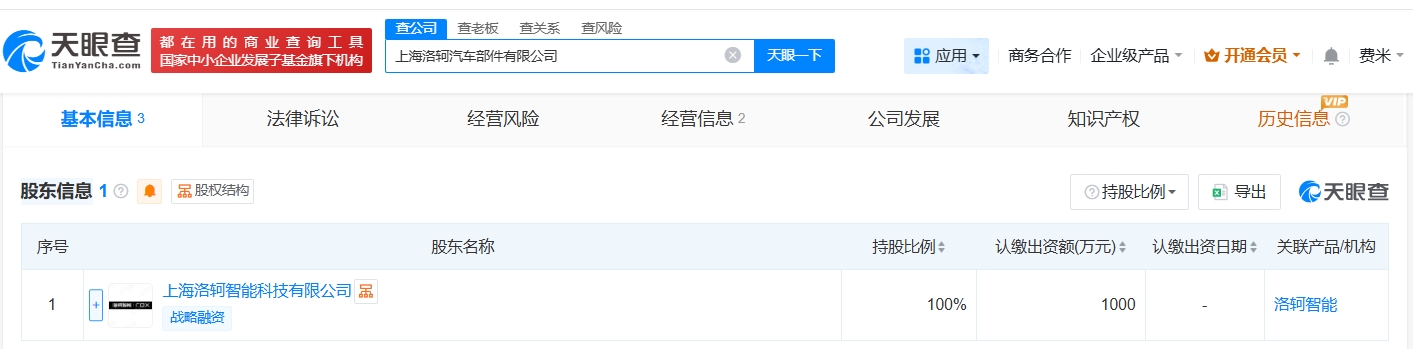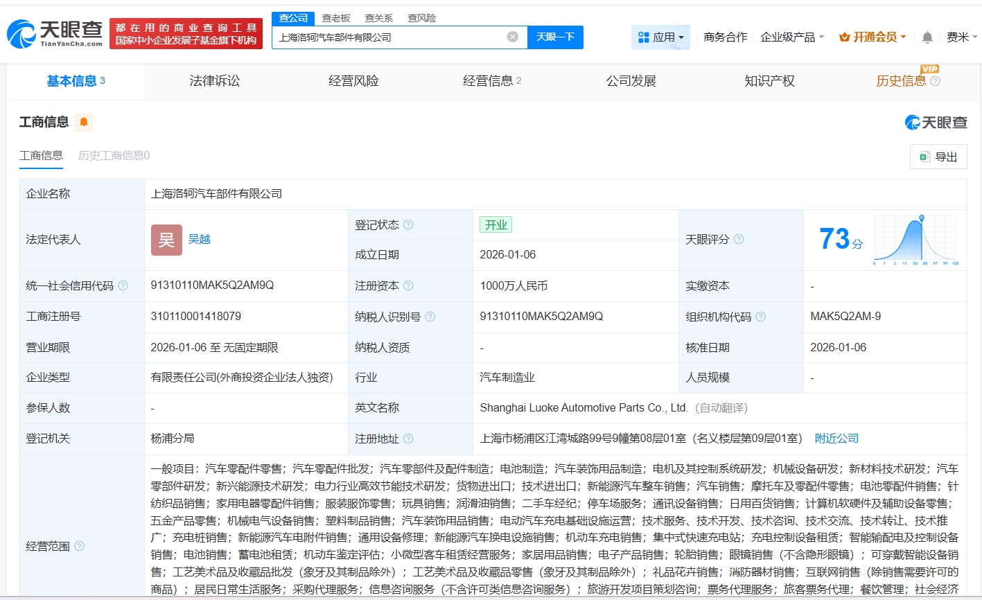 每经AI快讯,天眼查工商信息显示,近日,上海洛轲汽车部件有限公司成立,法定代表人为吴越,注册资本1000万元人民币,经营范围包括汽车零配件零售、汽车零配件批发、汽车零部件及配件制造、电池制造等。股东信息显示,该公司由极石汽车关联企业上海洛轲智能科技有限公司全资持股。