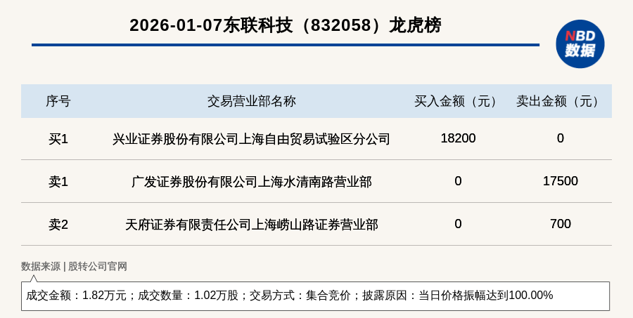 每经讯,2026年1月7日,新三板基础层公司东联科技(832058,收盘价:3.5元)登上龙虎榜,交易方式是集合竞价,披露原因是当日价格振幅达到100.00%,成交数量1.02万股,成交金额1.82万元。买一席位为兴业证券股份有限公司上海自由贸易试验区分公司,买入1.82万元;卖一席位为广发证券股份有限公司上海水清南路营业部,卖出1.75万元。