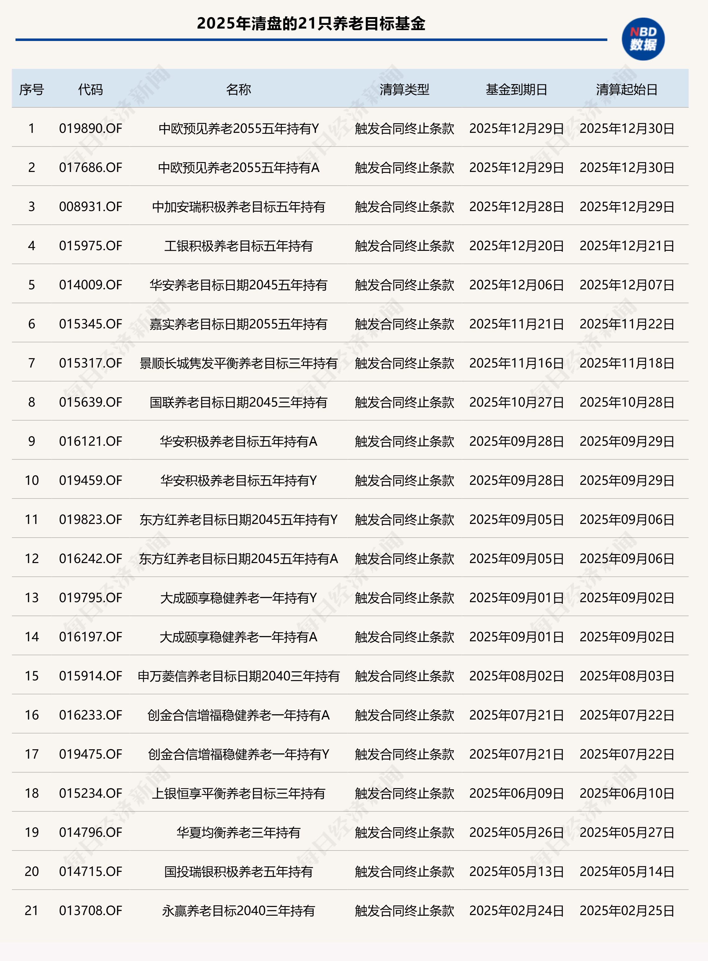 再从清盘方面来看,Wind数据显示,2025年共有21只养老目标基金清盘(不同份额分开计算),其中有5只养老目标基金Y份额清盘。
