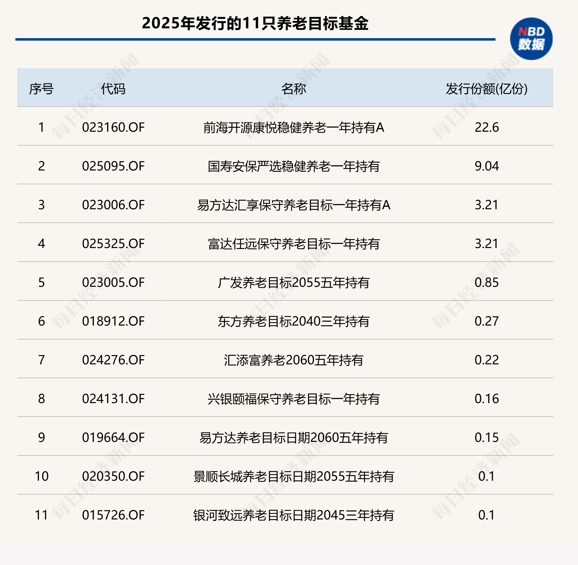 再从养老目标基金全年的发行情况来看,Wind数据显示,2025年全年仅有11只养老目标基金新成立,累计成立规模不足40亿元。其中有7只产品的成立规模低于2亿元。