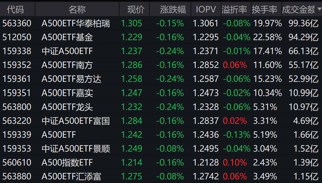 截至上午收盘,场内跟踪中证A500指数的ETF小幅下跌。其中,有12只中证A500相关ETF成交额超1亿元,2只超94亿元。A500ETF华泰柏瑞、A500ETF基金早盘成交额分别为99.36亿元、94.29亿元。