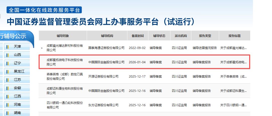 中国证监会网站显示,成都星拓微电子科技股份有限公司(以下简称“星拓微电子”)已于1月4日在四川证监局办理辅导备案登记,辅导机构为中金公司。这意味着,这家成立仅六年、近期入选四川省首批“种子独角兽”名单的芯片设计企业,正式开启了冲击A股的征程。在半导体行业处于周期性调整与AI结构性行情交织的当下,星拓微电子的上市进展,成为了观察西部硬科技企业资本化路径的一个最新样本。