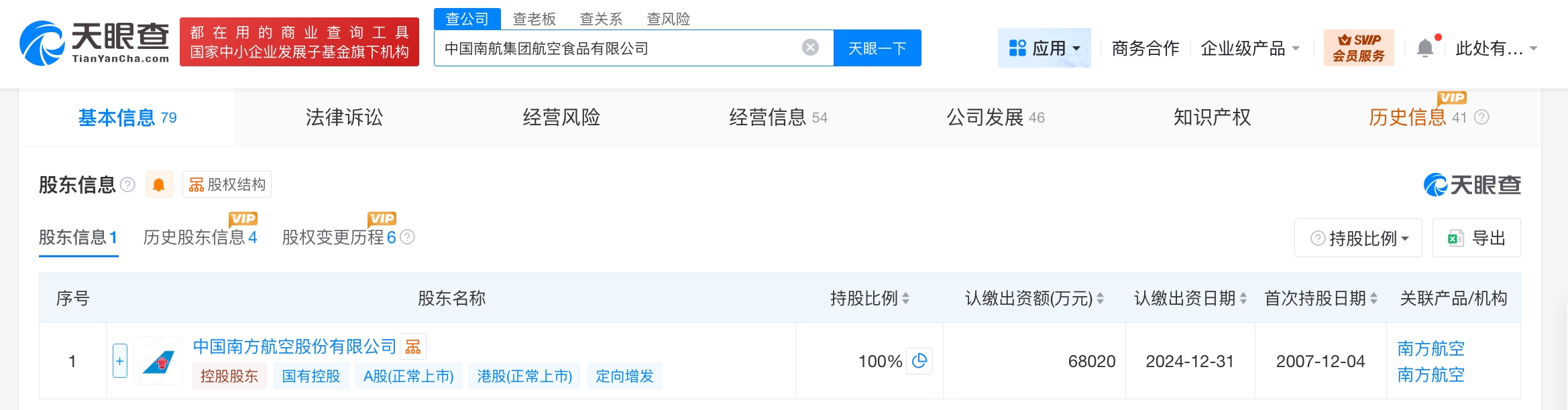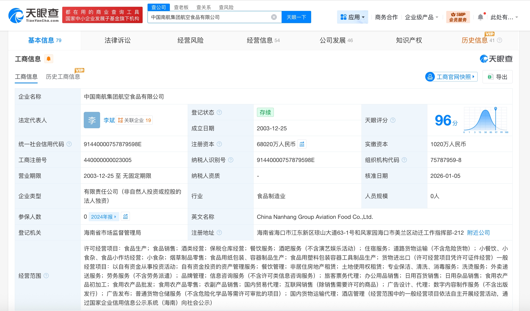 每经AI快讯,天眼查App显示,近日,中国南航集团航空食品有限公司发生工商变更,注册资本由1020万元人民币增至约6.8亿元人民币,增幅约6569%。该公司成立于2003年12月,法定代表人为李斌,经营范围含食品生产、食品销售、酒类经营、餐饮服务、自有资金投资的资产管理服务、餐饮管理、非居住房地产租赁等。股东信息显示,该公司由南方航空(600029)全资持股。