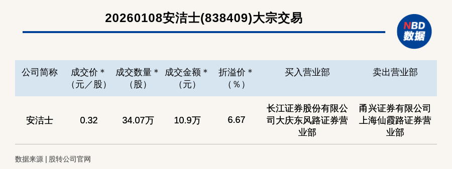 每经讯,2026年1月8日,新三板基础层公司安洁士(838409,收盘价:0.3元)发生一笔大宗交易,成交价0.32元/股,成交数量34.07万股,成交金额10.9万元,溢价6.67%。买入营业部是长江证券股份有限公司大庆东风路证券营业部,卖出营业部是甬兴证券有限公司上海仙霞路证券营业部。