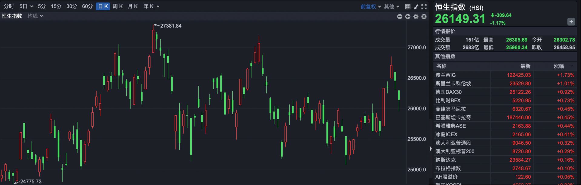 截至收盘,恒生指数报收26149.31点,下跌309.54点,跌幅1.17%。