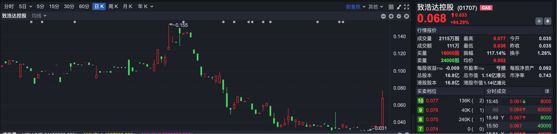 焦点公司方面,致浩达控股(HK01707)股价诡异拉升,盘中最大涨幅达到120%,最终收盘涨幅超过94.29%。截至今日收盘,致浩达控股市值约1.14亿港元。