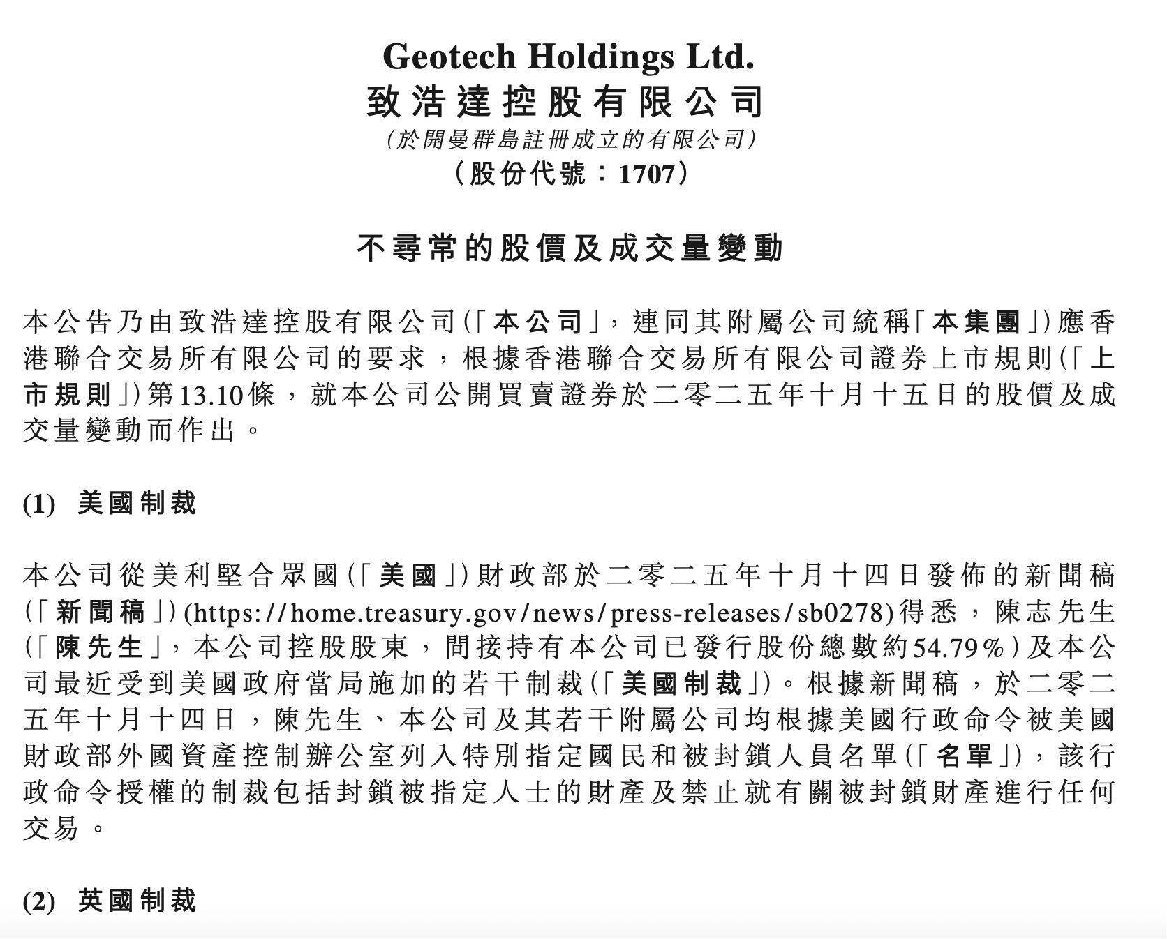 去年10月15日,致浩达控股发布公告称,公司控股股东陈志被美国和英国制裁。陈志在去年7月辞任了致浩达控股执行董事、董事会主席职务,骆嘉健被委任为执行董事。但去年10月27日,骆嘉健也辞任了致浩达控股所有职务。