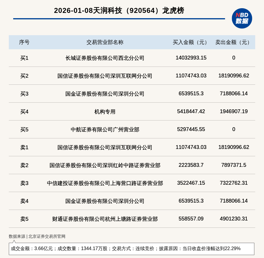 每经讯,2026年1月8日,北交所上市公司天润科技(920564,收盘价:28.36元)登上龙虎榜,交易方式是连续竞价,披露原因是当日收盘价涨幅达到22.29%,成交数量1344.17万股,成交金额3.66亿元。买一席位为长城证券股份有限公司西北分公司,买入1403.3万元;卖一席位为国信证券股份有限公司深圳互联网分公司,卖出1819.1万元。