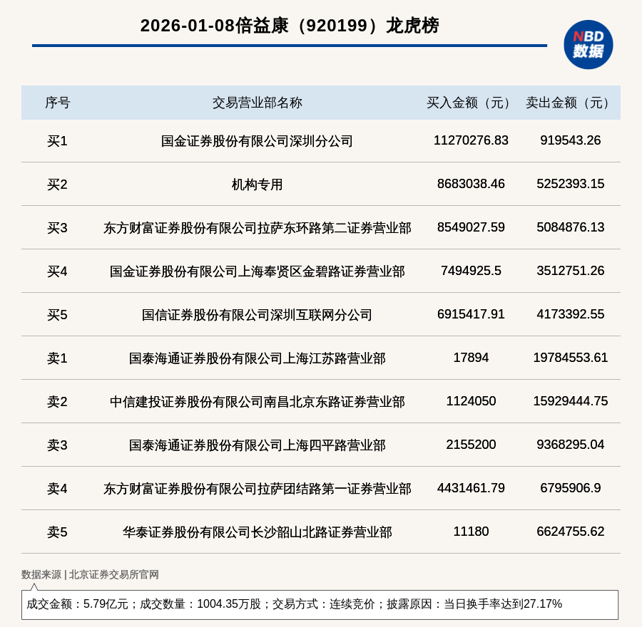 每经讯,2026年1月8日,北交所上市公司倍益康(920199,收盘价:56.69元)登上龙虎榜,交易方式是连续竞价,披露原因是当日换手率达到27.17%,成交数量1004.35万股,成交金额5.79亿元。买一席位为国金证券股份有限公司深圳分公司,买入1127.03万元;卖一席位为国泰海通证券股份有限公司上海江苏路营业部,卖出1978.46万元。