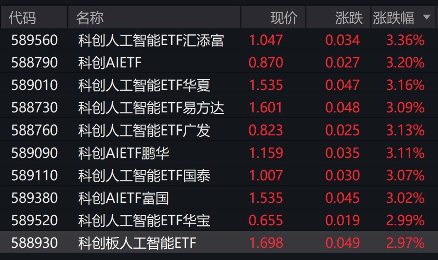 受盘面影响,科创人工智能相关ETF涨约3%。