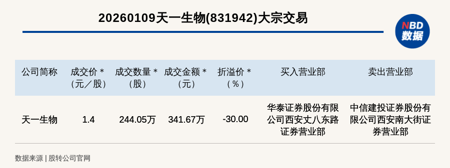 每经讯,2026年1月9日,新三板基础层公司天一生物(831942,收盘价:2元)发生一笔大宗交易,成交价1.4元/股,成交数量244.05万股,成交金额341.67万元,折价30%。买入营业部是华泰证券股份有限公司西安丈八东路证券营业部,卖出营业部是中信建投证券股份有限公司西安南大街证券营业部。