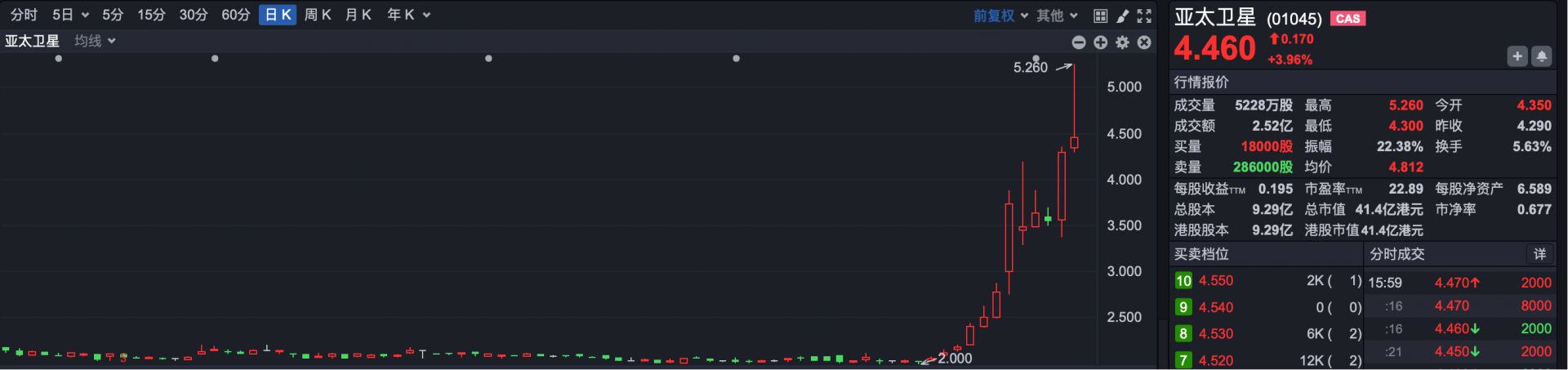 热点方面,商业航天概念强势,亚太卫星(HK01045)一度涨超22%,但收盘涨幅收窄至3.96%。