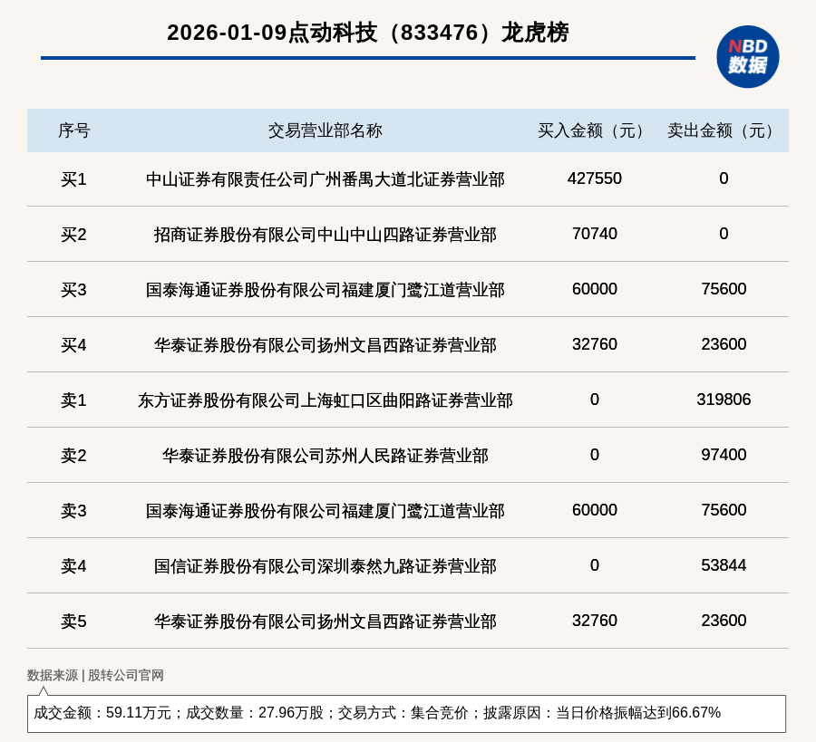 每经讯,2026年1月9日,新三板基础层公司点动科技(833476,收盘价:3元)登上龙虎榜,交易方式是集合竞价,披露原因是当日价格振幅达到66.67%,成交数量27.96万股,成交金额59.11万元。买一席位为中山证券有限责任公司广州番禺大道北证券营业部,买入42.76万元;卖一席位为东方证券股份有限公司上海虹口区曲阳路证券营业部,卖出31.98万元。