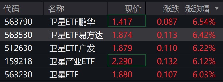 受盘面影响,卫星相关ETF涨超6%。