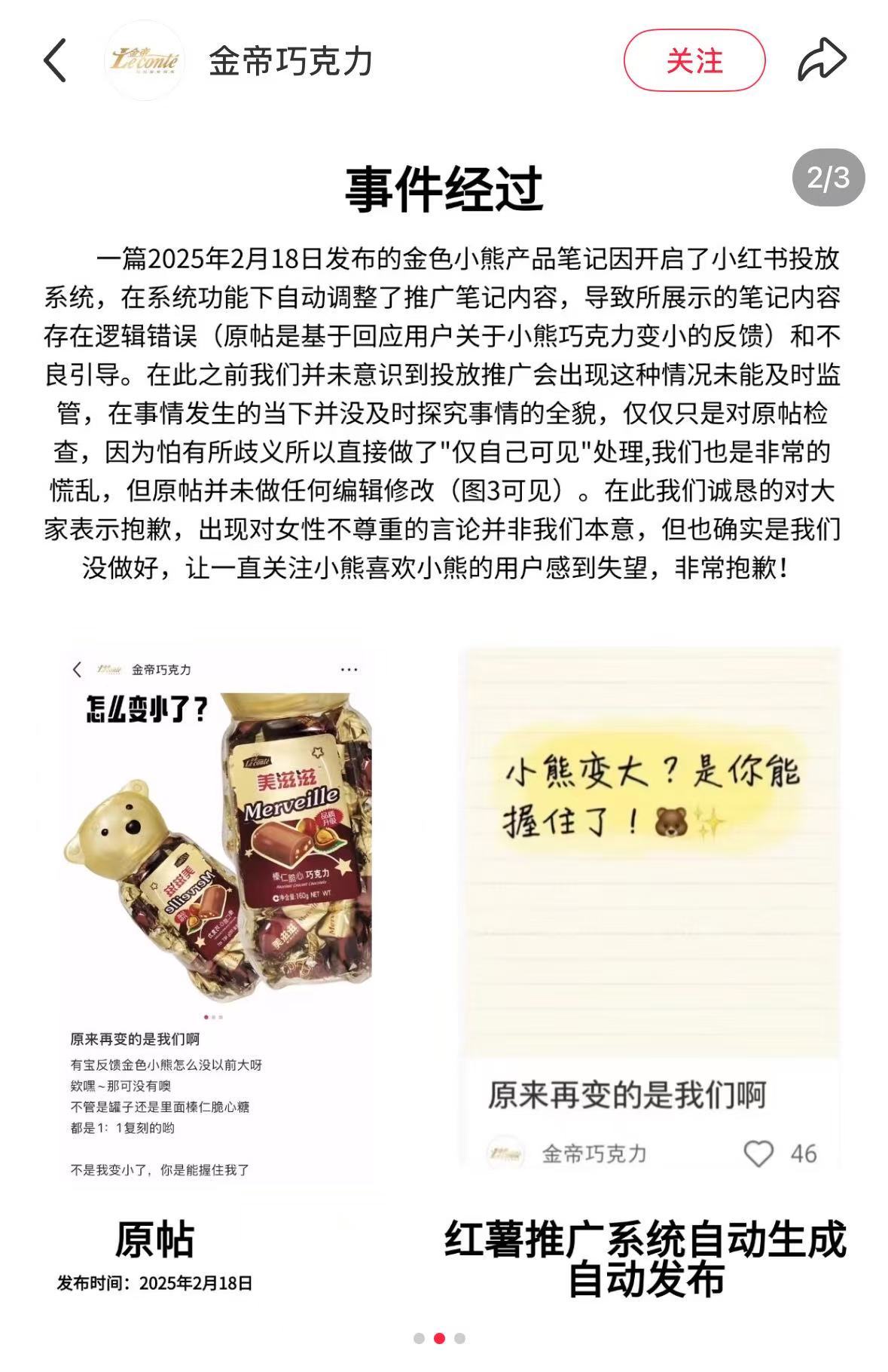 金帝巧克力在声明中解释称,事件的起因很简单,之前有用户反馈,复产后的金色小熊比小时候小了,品牌方便发布了产品笔记,品牌原意是讲述产品按原版1:1复刻、没有缩减尺寸的事实。但因为开启的小红书千帆投放有“自动优化功能”,这个功能会自动拆分、组合笔记的图片、标题等元素,导致系统自动优化后生成了算法视角的大字报笔记并对外展示。