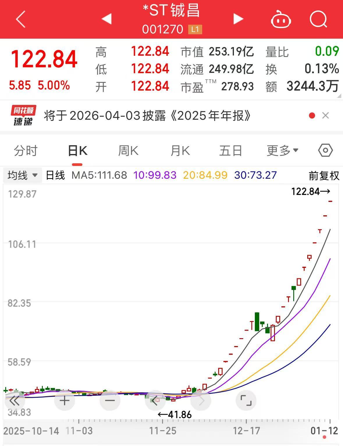 值得一提的是,*ST铖昌股价自去年12月1日以来出现大幅拉升,至今累计涨幅达177%,近11个交易日收获10个涨停板。