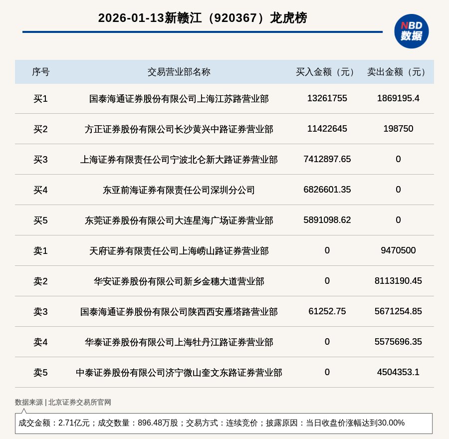 每经讯,2026年1月13日,北交所上市公司新赣江(920367,收盘价:30.55元)登上龙虎榜,交易方式是连续竞价,披露原因是当日收盘价涨幅达到30.00%,成交数量896.48万股,成交金额2.71亿元。买一席位为国泰海通证券股份有限公司上海江苏路营业部,买入1326.18万元;卖一席位为天府证券有限责任公司上海崂山路证券营业部,卖出947.05万元。