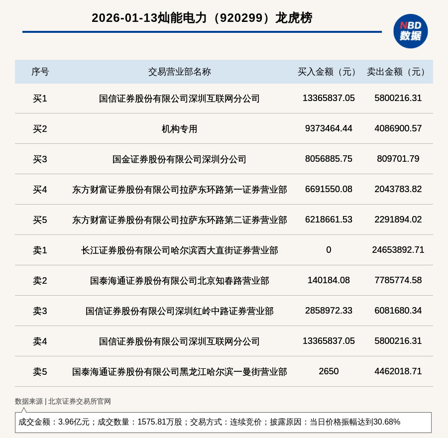 每经讯,2026年1月13日,北交所上市公司灿能电力(920299,收盘价:26.05元)登上龙虎榜,交易方式是连续竞价,披露原因是当日价格振幅达到30.68%,成交数量1575.81万股,成交金额3.96亿元。买一席位为国信证券股份有限公司深圳互联网分公司,买入1336.58万元;卖一席位为长江证券股份有限公司哈尔滨西大直街证券营业部,卖出2465.39万元。