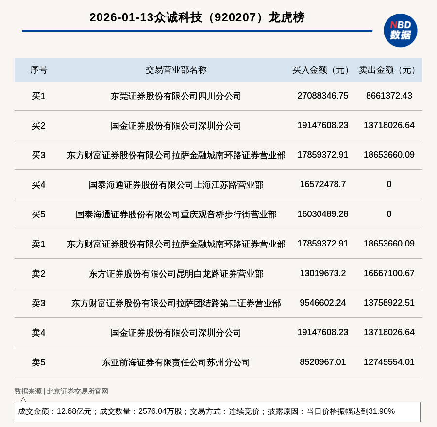 每经讯,2026年1月13日,北交所上市公司众诚科技(920207,收盘价:42.37元)登上龙虎榜,交易方式是连续竞价,披露原因是当日价格振幅达到31.90%,成交数量2576.04万股,成交金额12.68亿元。买一席位为东莞证券股份有限公司四川分公司,买入2708.83万元;卖一席位为东方财富证券股份有限公司拉萨金融城南环路证券营业部,卖出1865.37万元。