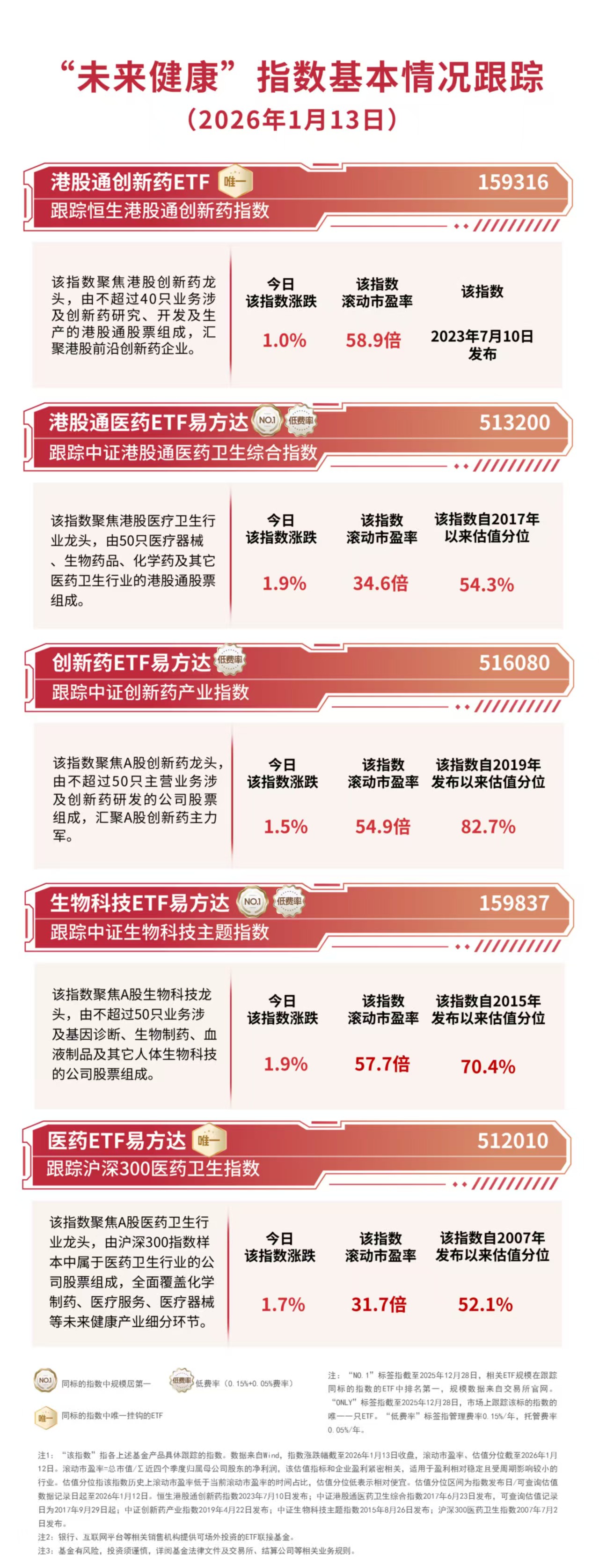 医药板块今日领涨,医疗服务、CRO等概念涨幅居前。截至收盘,中证港股通医药卫生综合指数、中证生物科技主题指数均上涨1.9%,沪深300医药卫生指数上涨1.7%,中证创新药产业指数上涨1.5%,恒生港股通创新药指数上涨1.0%。相关ETF交投活跃,港股通创新药ETF易方达(159316)和医药ETF易方达(512010)今日成交额分别达8.2亿元和10.9亿元,均较前几日有所放量。