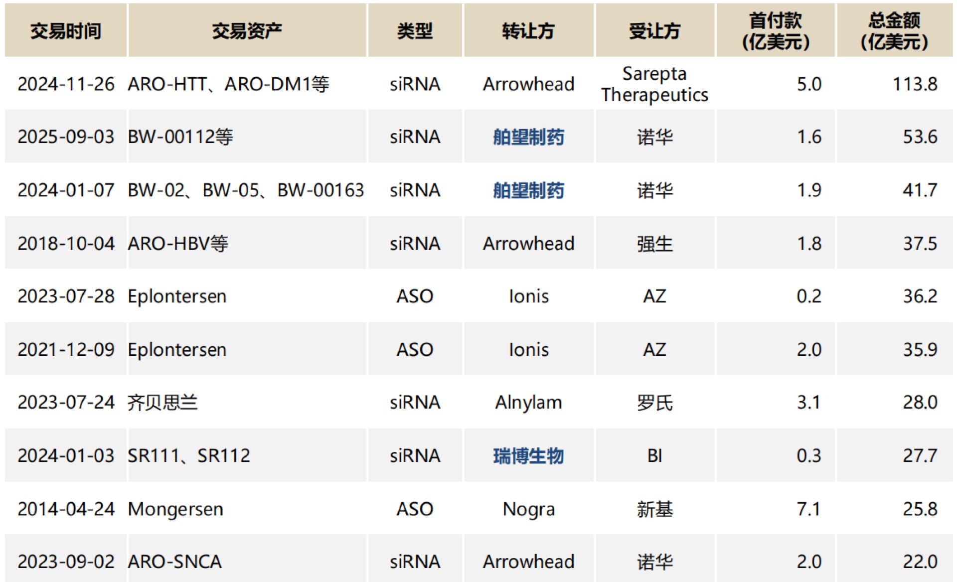全球小核酸药物BD(商务拓展)交易TOP10 图片来源:爱建证券研报