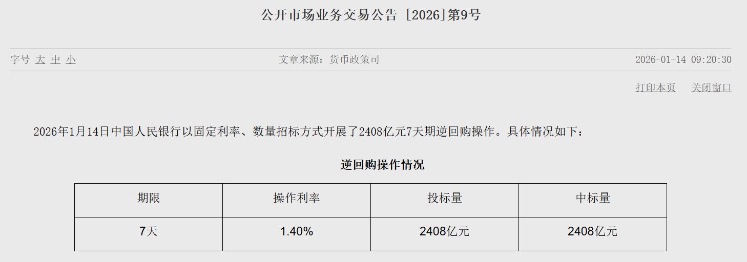 1月14日,央行发布公告,为保持银行体系流动性充裕,2026年1月15日,中国人民银行将以固定数量、利率招标、多重价位中标方式开展9000亿元买断式逆回购操作,期限为6个月(181天)。