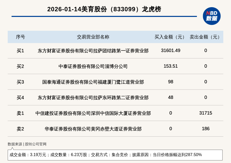 每经讯,2026年1月14日,新三板创新层公司美育股份(833099,收盘价:0.51元)登上龙虎榜,交易方式是集合竞价,披露原因是当日价格振幅达到287.50%,成交数量6.23万股,成交金额3.19万元。买一席位为东方财富证券股份有限公司拉萨团结路第一证券营业部,买入3.16万元;卖一席位为中信建投证券股份有限公司深圳中信国际大厦证券营业部,卖出3.17万元。