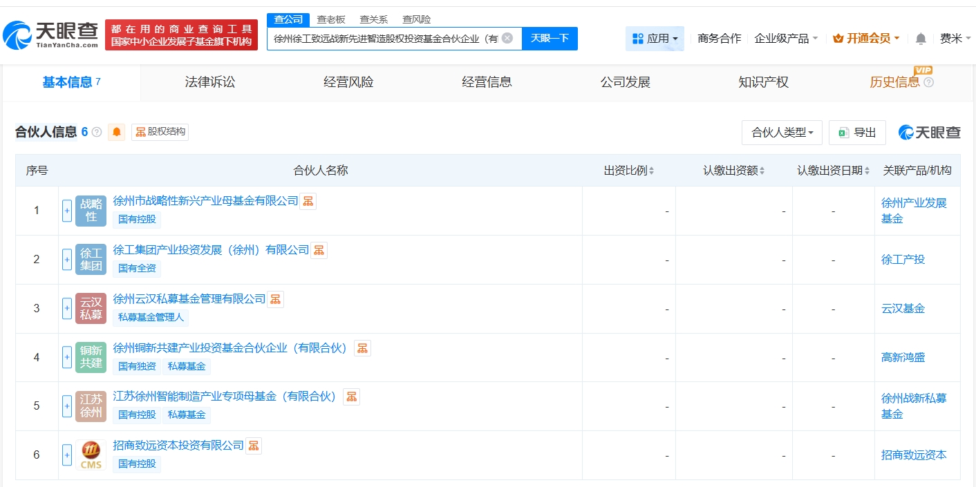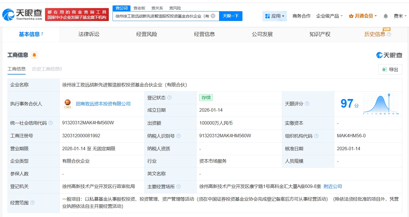 每经AI快讯,天眼查工商信息显示,近日,徐州徐工致远战新先进智造股权投资基金合伙企业(有限合伙)成立,执行事务合伙人为招商致远资本投资有限公司,出资额10亿元人民币,经营范围为以私募基金从事股权投资、投资管理、资产管理等活动。合伙人信息显示,该基金由徐州市战略性新兴产业母基金有限公司、徐工集团产业投资发展(徐州)有限公司、招商证券(600999)旗下招商致远资本投资有限公司等共同出资。