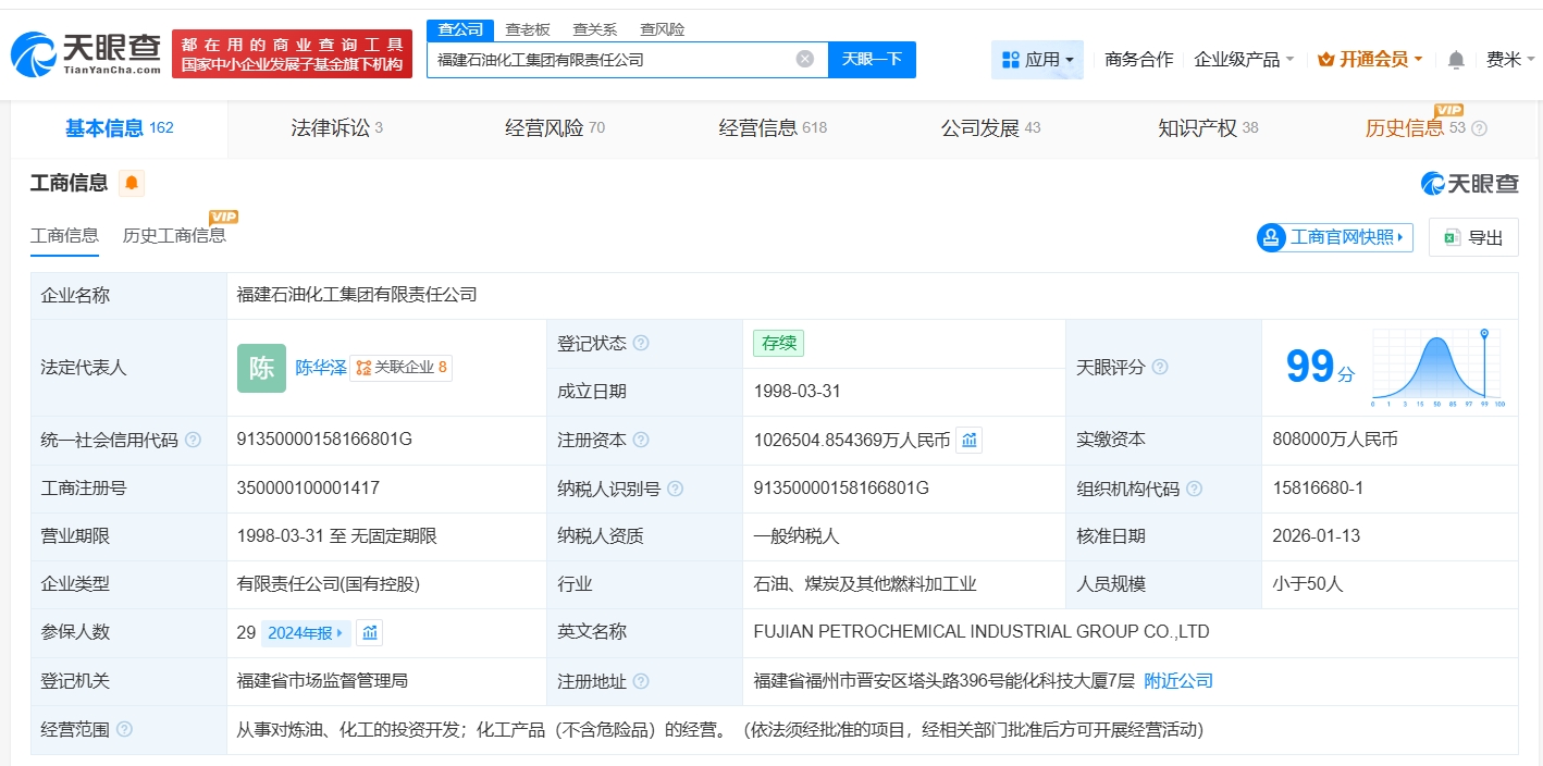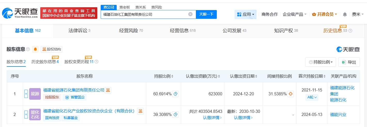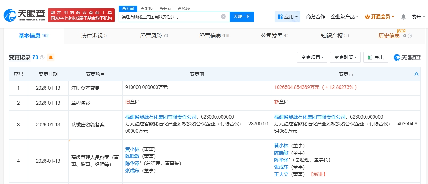 每经AI快讯,天眼查工商信息显示,近日,福建石油化工集团有限责任公司发生工商变更,注册资本由91亿元人民币增至约102.65亿元人民币,增幅约13%,同时部分主要人员发生变更。福建石油化工集团有限责任公司成立于1998年3月,法定代表人为陈华泽,经营范围为从事对炼油、化工的投资开发,化工产品的经营。股东信息显示,该公司由福建省能源石化集团有限责任公司、福建省能化石化产业股权投资合伙企业(有限合伙)共同持股。