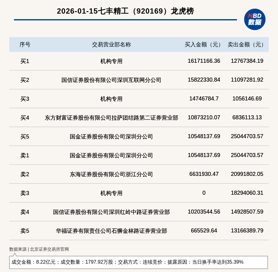 每经讯,2026年1月15日,北交所上市公司七丰精工(920169,收盘价:45.3元)登上龙虎榜,交易方式是连续竞价,披露原因是当日换手率达到35.39%,成交数量1797.92万股,成交金额8.22亿元。买一席位为机构专用,买入1617.12万元;卖一席位为国金证券股份有限公司深圳分公司,卖出2504.47万元。