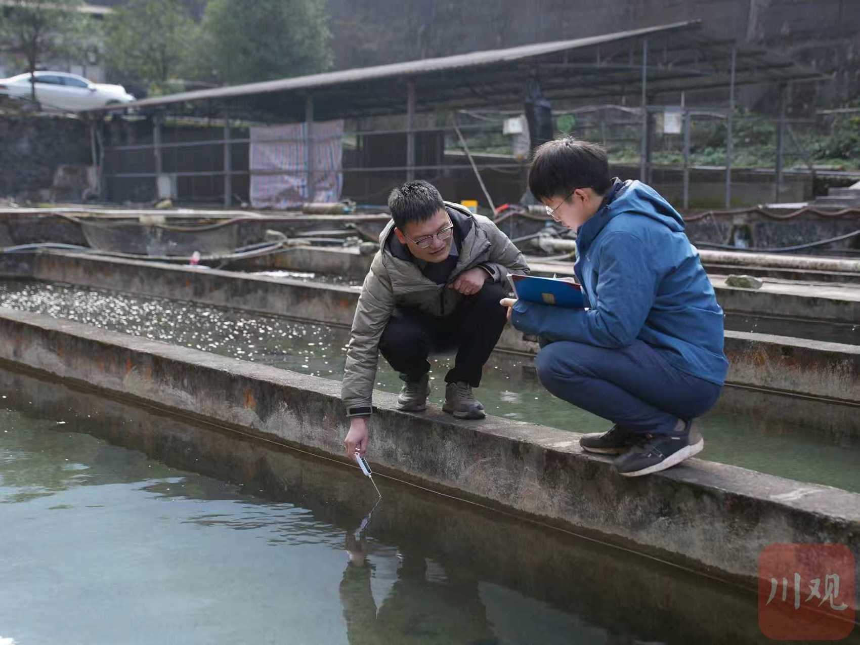 杨焕超(左)和同事在测量记录鱼池水温