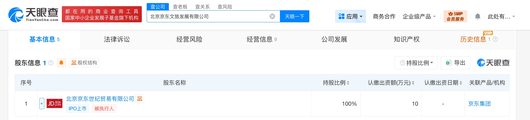 每经AI快讯,天眼查工商信息显示,近期,北京京东文旅发展有限公司成立,法定代表人为张一泓,注册资本10万元人民币,经营范围含旅游业务、歌舞娱乐活动、旅客票务代理、航空商务服务、体验式拓展活动及策划、组织文化艺术交流活动、企业总部管理、票务代理服务、规划设计管理、旅游开发项目策划咨询等。股东信息显示,该公司由北京京东世纪贸易有限公司全资持股。